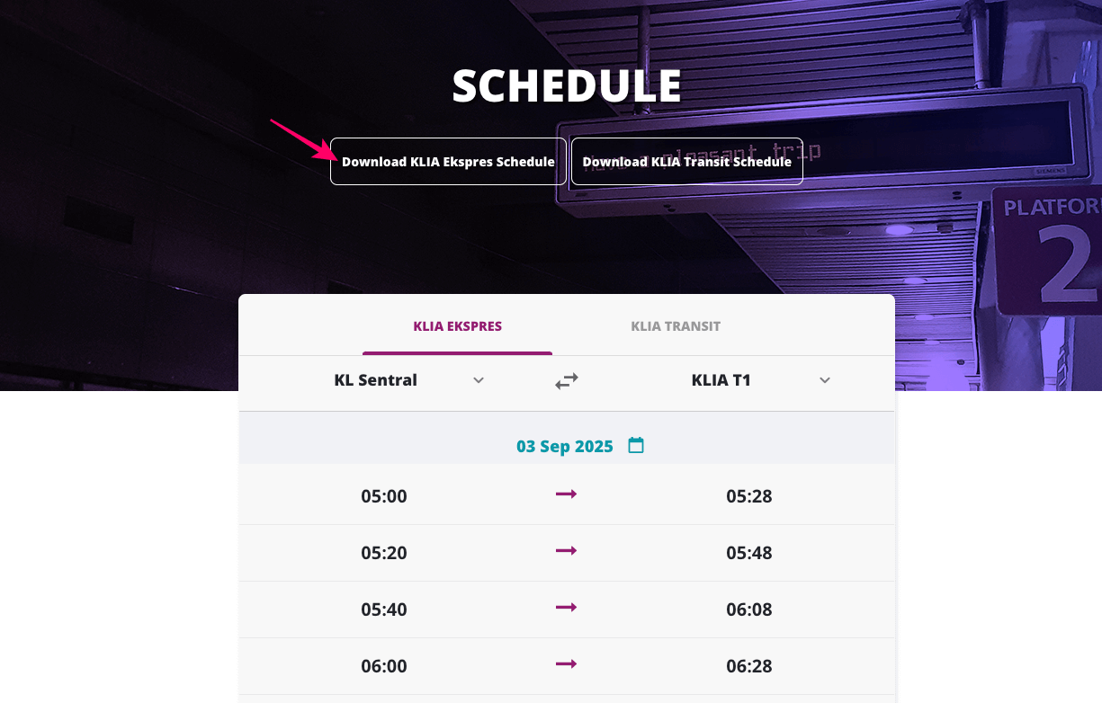 KLIAエクスプレス公式サイトやアプリのScheduleからKLIAエクスプレスとKLIAトランジットの時刻表がそれぞれ確認できます。